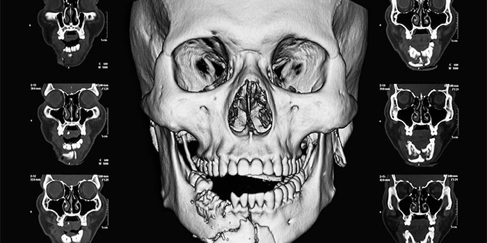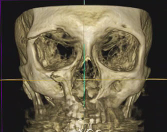 Example: A 3D scan showing a fracture of the right cheekbone, with a vertical line running from the right eye socket down to the top jaw.